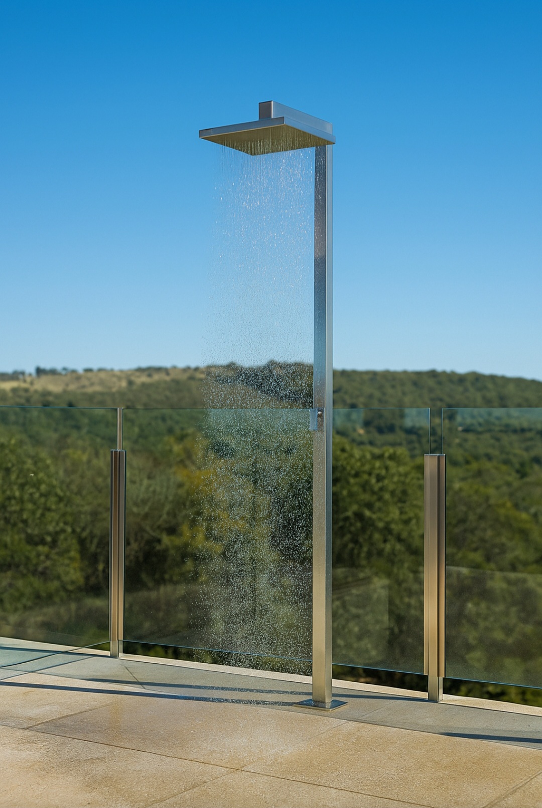 Detalhes: Ducha para piscina com chuveiro com medidas 280x280mm, rosca 1/2 polegada, haste em perfil 50x50mm com registro de 1/4 volta Deca, sapata para fixação de 150x150mm com parafusos e buchas. altura de 2,20mt.